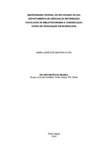 Monografia defendida em 2020 pela discente Maria José dos Santos Alves sob orientação da professora do curso de Museologia, Marlise Maria Giovanaz. Compuseram a banca avaliadora as profissionais Ana Ramos Rodrigues Castro e Doris Rosangela Freitas do Couto. O ano de ingresso no curso foi 2015 e o de conclusão 2021. Realizou estágio obrigatório no Centro Histórico-Cultural da Santa Casa de Porto Alegre e no Museu Julio de Castilhos. Foi curadora da exposição curricular No Escurinho do Cinema: memória e sociabilidade em Porto Alegre (2020). Possui graduação História pela Universidade Federal do Rio Grande do Sul (2005). Mestrado em Educação pela Universidade Federal do Rio Grande do Sul (2010). Trabalhou em três edições da Bienal de Artes Visuais do Mercosul (2015 e 2018 como mediadora e, em 2022, como supervisora). É professora de História pela Prefeitura Municipal de São Leopoldo.