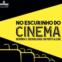 O objeto nato digital apresenta um fundo preto onde um feixe luminoso amarelo partindo do centro à esquerda até o canto superior direito. No canto superior esquerdo apresenta-se na cor branca a logo do curso de Museologia da UFRGS. Lê-se "No Escurinho do Cinema" no centro à direita na cor preta. Abaixo esta a descrição da exposição "Memória e sociabilidade em Porto Alegre" também na cor preta. Em primeiro plano observam-se a silhuetas de cadeiras de cinemas que projetam-se partindo do canto inferior esquerdo até embaixo no centro.