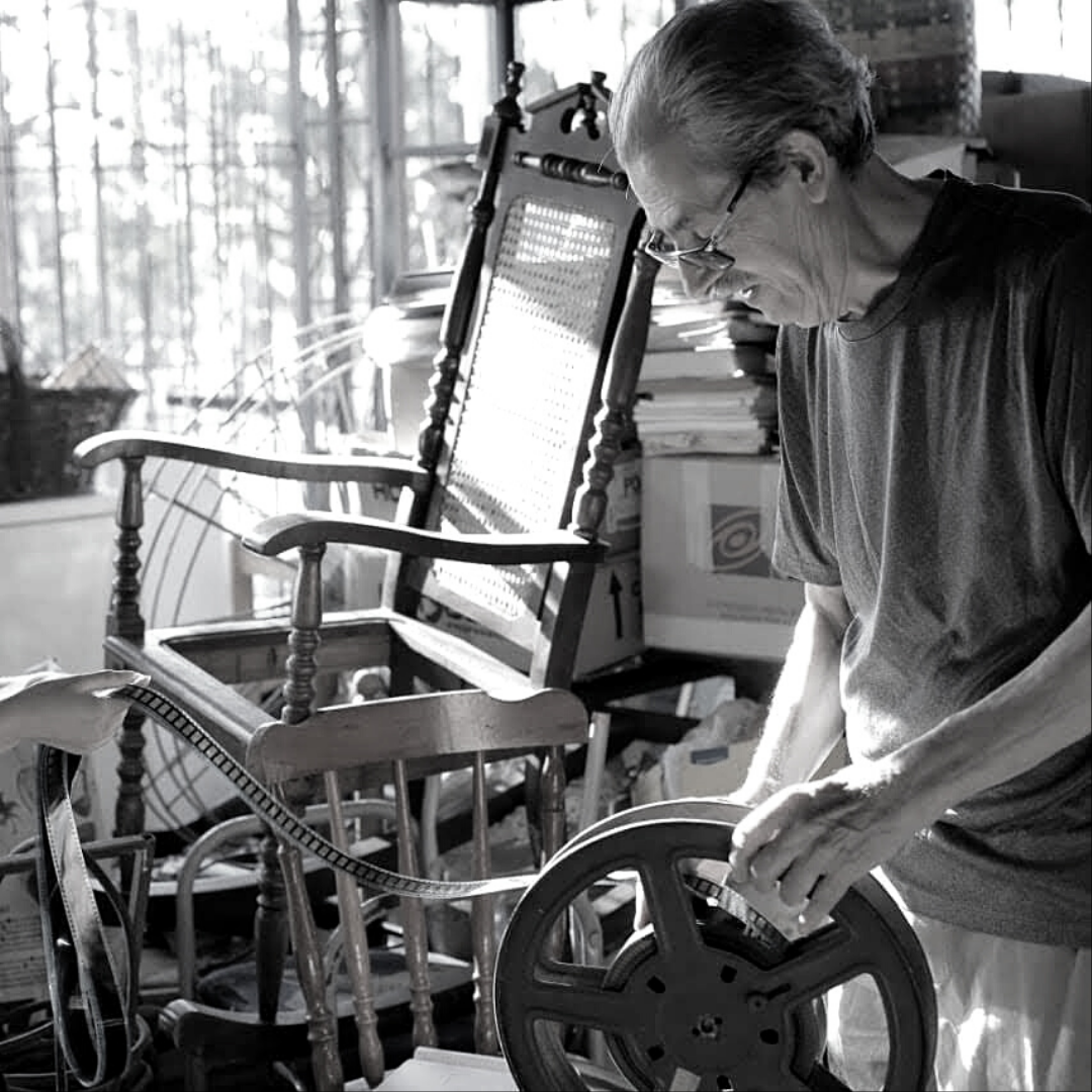 Fotografia em preto e branco, ao fundo observa-se uma janela gradeada e uma cadeira de balanço em madeira. Diversos outros objetos compõem o cenário em um amontoado de caixas, livros e outros elementos menos identificáveis. Em primeiro plano a direita uma figura masculina idosa segura um rolo de filme, a figura olha para baixo com o pescoço arqueado. Uma mão a esquerda da fotografia segura o filme que projeta-se do rolo em sua direção.