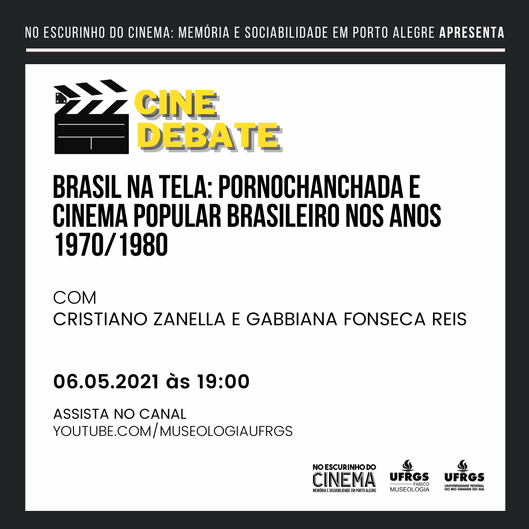 A imagem apresenta uma moldura preta que destaca um fundo branco onde encontram-se as principais informações. A cima, na moldura pode-se ler o título da exposição. No canto superior esquerdo observa-se uma claquete ao lado do seguinte texto em amarelo: "Cine debate". Ao centro, em letras pretas lê-se: "Brasil na tela: Pornochanchada e cinema brasileiro nos anos 1970/1980". O resto da imagem apresenta os participantes do debate, data, horário e local (canal do youtube do curso de Museologia). No canto inferior direito observa-se as logos da exposição, do curso de Museologia e da UFRGS.