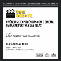 A imagem apresenta uma moldura preta que destaca um fundo branco onde encontram-se as principais informações. A cima, na moldura pode-se ler o título da exposição. No canto superior esquerdo observa-se uma claquete ao lado do seguinte texto em amarelo: "Cine debate". Ao centro, em letras pretas lê-se: "Vivências e experiências com o cinema: Um olhar por trás das telas". O resto da imagem apresenta os participantes do debate, data, horário e local (canal do youtube do curso de Museologia). No canto inferior direito observa-se as logos da exposição, do curso de Museologia e da UFRGS.