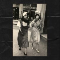 O fundo preto texturizado é utilizado como margem para uma fotografia retangular centralizada. A fotografia em preto e branco apresenta ao fundo estabelecimentos comerciais e o que parece ser a rua de uma cidade. Ao centro observa-se duas figuras femininas trajam roupas do século 20, a figura da esquerda utiliza um chapéu branco, e um cachecol na cor preta. A figura ainda traja um vestido preto com branco e luvas e sapatos na cor preta. A figura da direita utiliza um cachecol que aparente ser feito a partir de algum animal, traja também um vestido com sapatos claros. Ambas parecem estar realizando a prática do "footing".