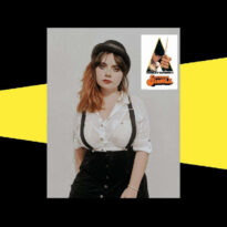 O fundo preto com amarelo é utilizado como margem para a imagem de uma figura feminina sob um fundo branco. A figura utiliza um chapéu coco preto, uma camisa social branca e uma saia preta presa com suspensórios também pretos. Ao canto superior direito observa-se a capa da versão de 1971 do filme Laranja Mecânica.