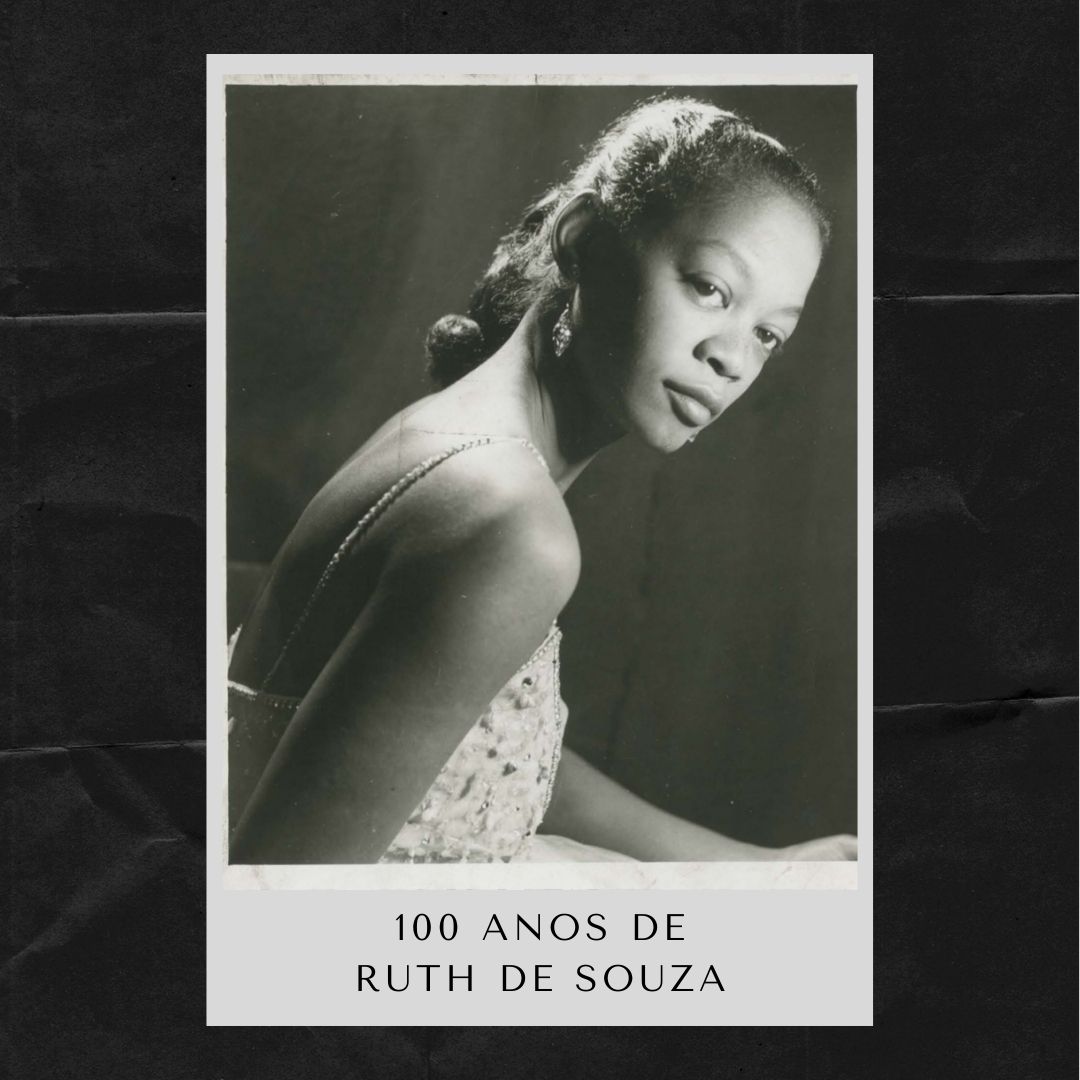A imagem apresenta um fundo preto e uma fotografia em preto e branco centralizada, esta apresenta uma figura feminina negra. A figura traja um vestido de alcinha e apresenta-se de lado com a cabeça virada em direção a câmera, as costas estão levemente arqueadas. Abaixo ao centro lê-se "'100 anos de Ruth de Souza".