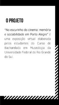 Sequência de stories utilizados como ferramenta de divulgação da exposição no Instagram. As 6 imagens possuem paleta de cores variando do branco e preto, com detalhes em amarelo. O primeiro storie caracteriza-se por um fundo branco, com margem superior e direita na cor preta. Ao centro esquerda na parte superior lê-se "O Projeto", seguido por um pequeno texto explicando a exposição. O antepenúltimo e penúltimo stories apresentam fotos da turma de Práticas Expográficas.