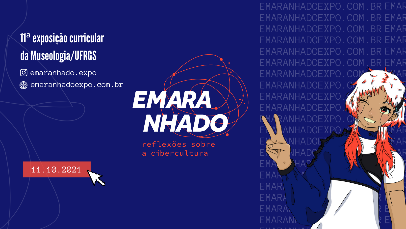 Capa de Facebook usada pelo Museu da UFRGS durante a exposição Emaranhado: Reflexões sobre a Cibercultura. Sobre fundo azul, consta a informação "11ª exposição curricular da Museologia/UFRGS", com endereços do Instagram e do site da exposição, data de abertura (11.10.2021), logo da exposição e uma imagem da cintura para cima da assistente virtual EMM, personagem produzida pela exposição. EMM aparece piscando o olho e fazendo sinal de V com os dedos.