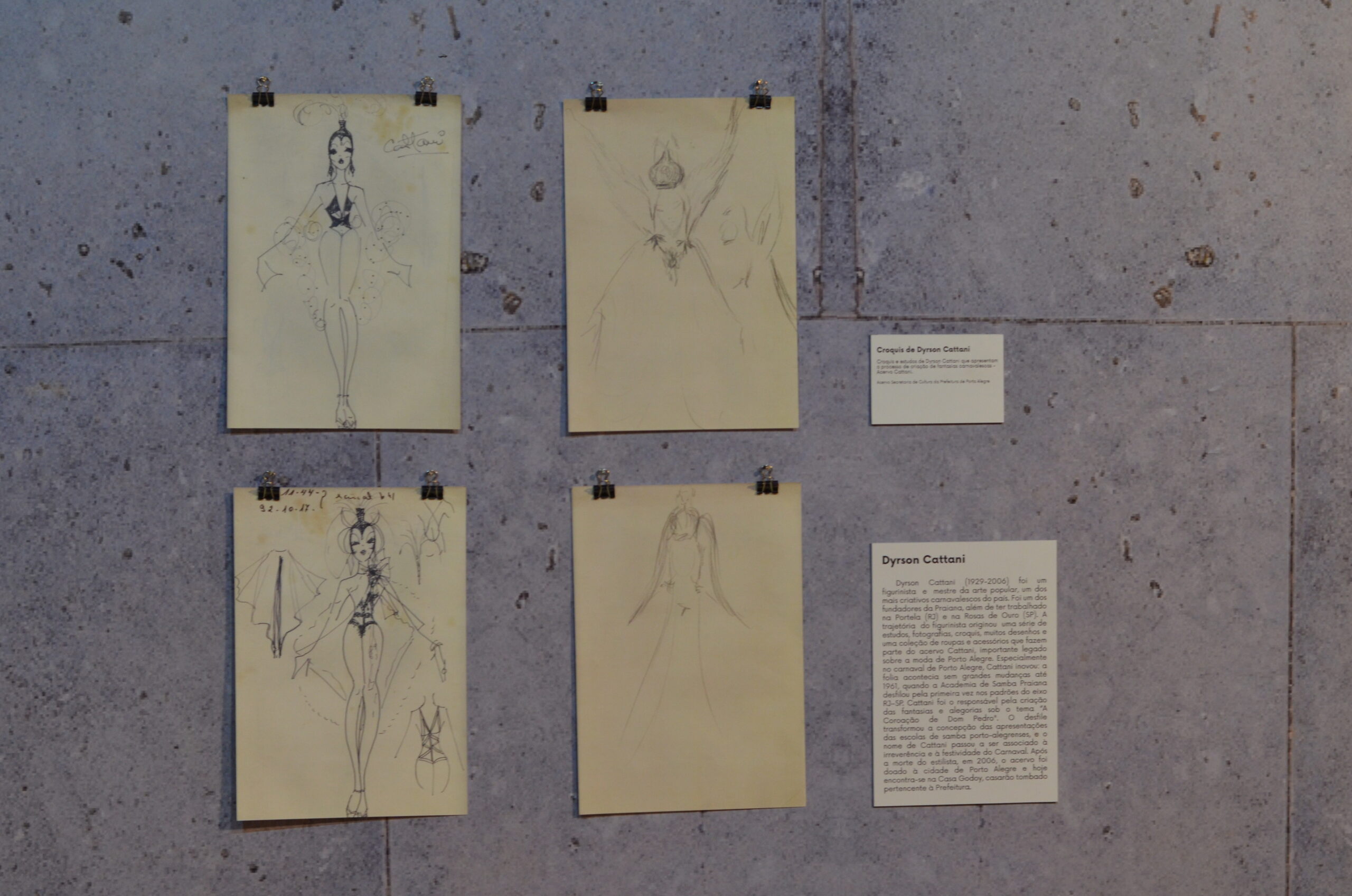 Em fundo cinza texturizado estão fixados 4 croquis apresentam o processo de criação das fantasias carnavalescas produzidos por Dyrson Cattani e ao lado texto sobre o artista.