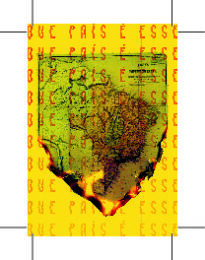 Adesivo utilizado na exposição "Brasil: Vermelho como Brasa", apresenta um fundo amarelo com a frase "Que pais é esse" repetida em toda sua extensão. Ao centro observa-se um mapa do Brasil pegando fogo pela parte inferior.