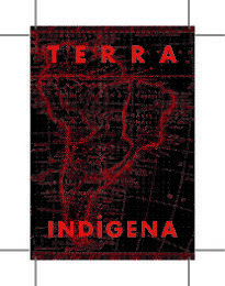 Adesivo utilizado na exposição "Brasil: Vermelho como Brasa", apresenta um fundo preto com o mapa da américa do sul na cor vermelha. Na parte superior central e na inferior central lê-se "Terra Indígena".