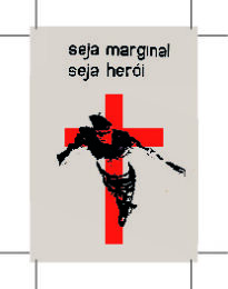 Adesivo utilizado na exposição "Brasil: Vermelho como Brasa", apresenta um fundo na cor bege, na parte superior central lê-se "Seja marginal, seja herói". No centro observa-se uma figura humana preta sobreposta com uma cruz vermelha centralizada.