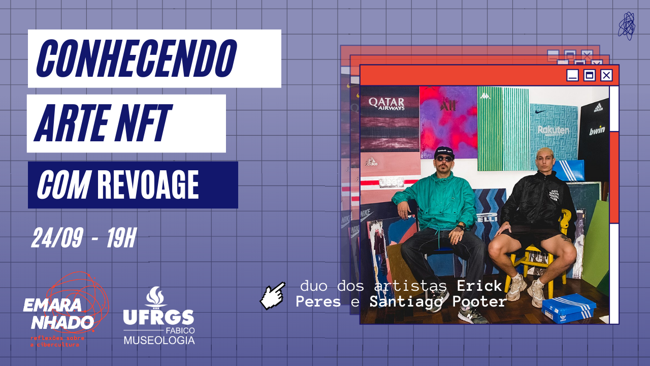 Capa do Youtube da live "Conhecendo arte NFT com Revoage", promovida pela exposição Emaranhado: Reflexões sobre a Cibercultura e que compôs a programação da 15ª Primavera dos Museus. Sobre fundo branco e azul claro, consta o título da live, informações sobre data e hora (24/09, 19h), os logotipos da exposição e do curso de Museologia da UFRGS, além de uma foto com os convidados, Erick Peres e Santiago Pooter, artistas integrantes do Revoage.
