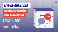 Capa do Youtube da live de abertura da exposição Emaranhado: Reflexões sobre a Cibercultura. Sobre fundo quadriculado branco e azul claro, consta o título da live, informações sobre data e hora (11/10, 19h), os logotipos da exposição e do curso de Museologia da UFRGS e três janelas de desktop sobrepostas, onde há balões de diálogo desenhados.