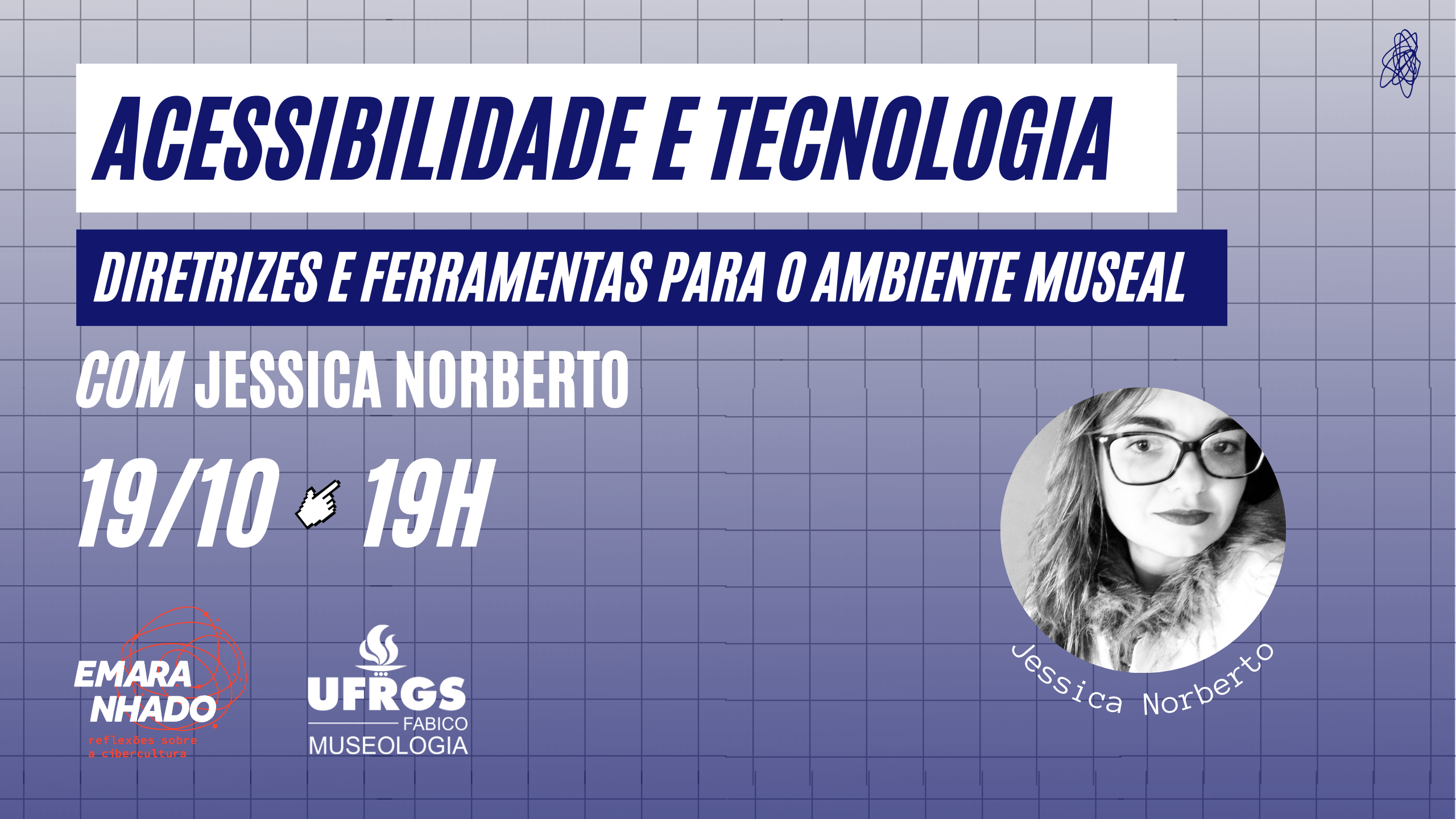 Capa do Youtube da live "Acessibilidade e tecnologia: diretrizes e ferramentas para o ambiente museal", segunda live educativa da exposição Emaranhado: Reflexões sobre a Cibercultura. Sobre fundo quadriculado branco e azul claro, consta o título da live, informações sobre data e hora (19/10, 19h), os logotipos da exposição e do curso de Museologia da UFRGS e foto da convidada, Jessica Norberto.