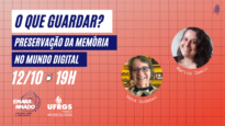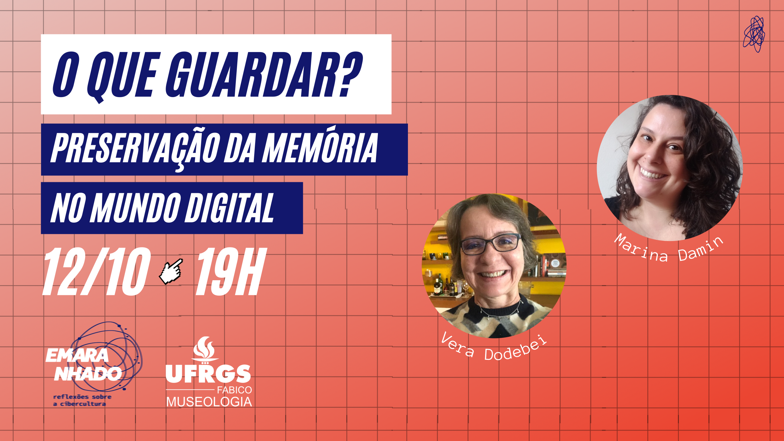 Capa do Youtube da live "O que guardar? preservação da memória no mundo digital", primeira live educativa da exposição Emaranhado: Reflexões sobre a Cibercultura. Sobre fundo quadriculado branco e laranja claro, consta o título da live, informações sobre data e hora (12/10, 19h), os logotipos da exposição e do curso de Museologia da UFRGS e fotos das convidadas, Vera Dodebei e Marina Damin.