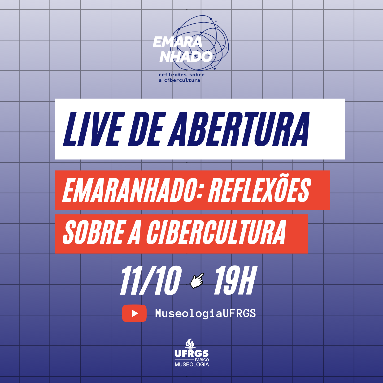 Card de divulgação da live de abertura da exposição Emaranhado: Reflexões sobre a Cibercultura. Sobre fundo quadriculado branco e azul claro, constam o logo da exposição, o título "live de abertura, Emaranhado: Reflexões sobre a Cibercultura, 11/10, 19h". Abaixo, o canal do YouTube Museologia UFRGS e o logo do curso de Museologia.