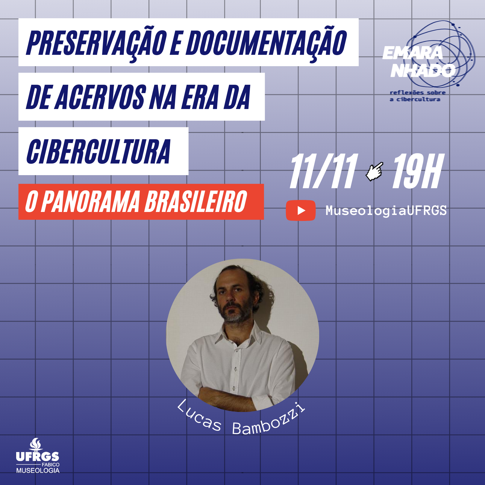 Card de divulgação da live "Preservação e documentação de acervos na era da cibercultura: o panorama brasileiro", da exposição Emaranhado: Reflexões sobre a Cibercultura. Sobre fundo quadriculado branco e laranja claro, constam o título da live, o logo da exposição, data e hora (11/11, 19h), o canal do YouTube Museologia UFRGS, foto do convidado (Lucas Bambozzi), e o logo do curso de Museologia.