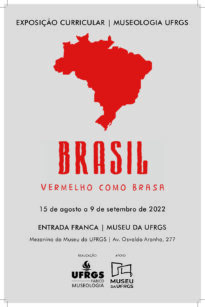Cartaz da exposição "Brasil: Vermelho como Brasa", apresenta fundo branco, na parte superior lê-se em texto preto "Exposição Curricular | Museologia UFRGS", ao centro uma imagem do mapa do Brasil na cor vermelha, o título da exposição aparece abaixo. Na metade inferior apresentam-se os textos sobre a localização da exposição.