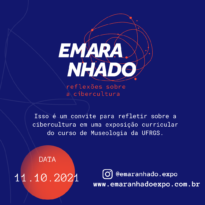 Convite para exposição "Emaranhado: Reflexões sobre a Cibercultura". Sobre fundo azul, abaixo do logo da exposição, lê-se "Isso é um convite para refletir sobre a cibercultura em uma exposição curricular do curso de Museologia da UFRGS." Abaixo, consta a data de abertura da exposição: 11.10.2021. Ao lado, o Instagram da exposição (@emaranhado.expo) e o site (www.emaranhadoexpo.com.br).