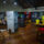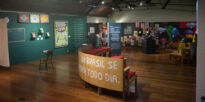 Fotografia da exposição curricular: "Brasil: Vermelho como Brasa". A imagem apresenta primariamente o núcleo escola à esquerda, representando pelas paredes verdes, e o núcleo rua ao centro, representado pelas paredes pretas.