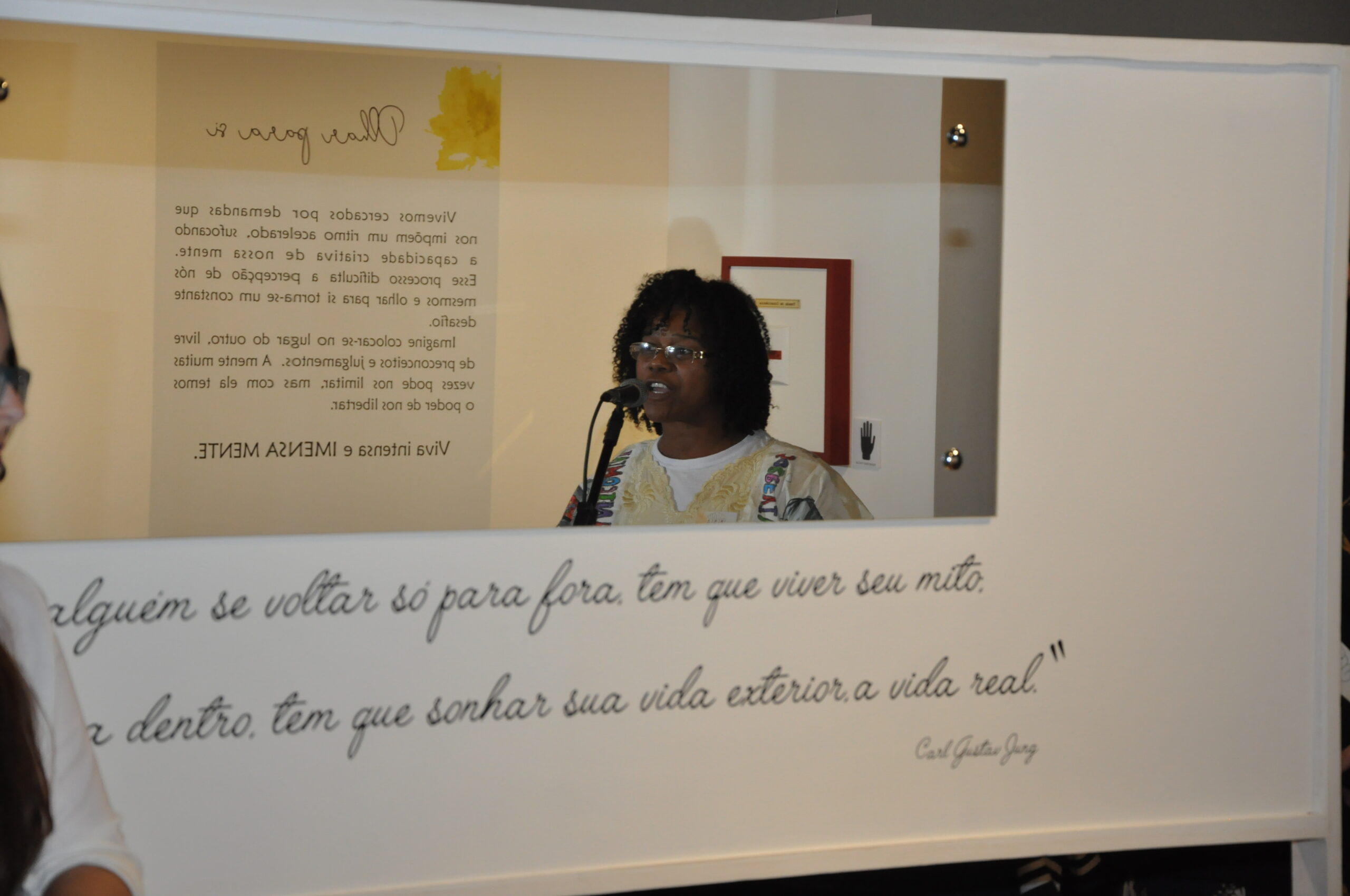 Fotografia com parcial da estrutura expográfica do recurso de espelho, no qual se reflete visitante interagindo com o circuito expositivo com uso de microfone. Observa-se ainda, refletivo, um dos textos expositivos adesivados em parede, e parcial de uma frase em caligrafia manual no suporte que fixa o espelho. À esquerda de quem olha a imagem, uma silhueta parcial de outra visitante observando a apresentação.