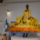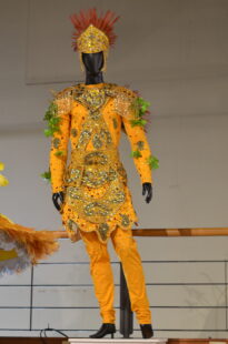 Fantasia de Mestre-Sala composta por coroa em tons de amarelo e dourado com aplicações de penas vermelhas no topo e pedraria e lantejoulas no corpo da coroa. As partes de cima e debaixo da fantasia tem fundo amarelo e apliações de pedraria e lantejoulas em dourado e amarelo, além de penas vermelhas e verdes.