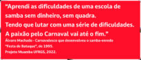 "Aprendi as dificuldades de uma escola de samba sem dinheiro, sem quadra. Tendo que lutar com uma série de dificuldades. A paixão pelo Carnaval vai até o fim."