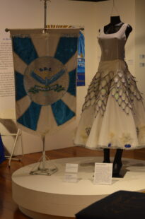 Cópia Digital de imagem do conjunto de parte da fantasia de Porta-estandarte e do estandarte que fez parte da exposição “No batuque dos Bambas da Orgia – Folia e resistência em Porto Alegre”