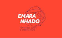 Logotipo da exposição curricular Emaranhado: Reflexões sobre a Cibercultura. O objeto nato digital apresenta um fundo laranja. Centralizada e sobreposta a linhas azuis que se emaranham, aparece a palavra Emaranhado em letras maiúsculas na cor branco. Abaixo, a expressão "reflexões sobre a cibercultura" em letras azuis.