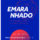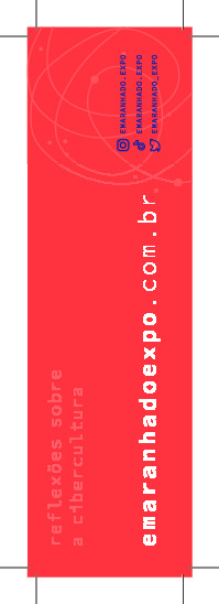 Marcador de páginas da exposição "Emaranhado: Reflexões sobre a Cibercultura". De um lado, sobre fundo azul, consta o logo da exposição e uma imagem da assistente virtual EMM, personagem produzida para a exposição. No verso, sobre fundo laranja, consta a frase "reflexões sobre a cibercultura", o site da exposição (emaranhadoexpo.com.br) e os endereços das redes sociais: emaranhado.expo para o Instagram, emaranhado.expo para o Spotify e emaranhado_expo para o Twitter.
