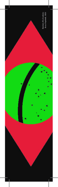 Marcado de página utilizado como souvenir da exposição "Brasil: Vermelho como Brasa", apresenta uma estilização da bandeira do Brasil com fundo preto e losango preto e circulo verde ao centro na primeira face, no verso em fundo branco e letras negras apresenta-se o terceiro artigo da constituição brasileira.