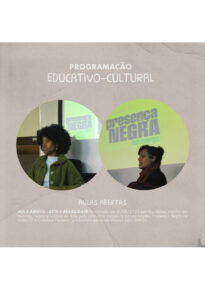 Sequência de imagens apresentando a programação educativo cultural da exposição curricular: "Brasil: Vermelho como Brasa". A primeira imagem apresenta fundo marrom claro, enquanto as imagens seguintes em fundo vermelho apresentam a programação educativa da exposição.