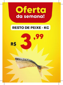 Encartes utilizados na cenografia do núcleo casa da exposição curricular "Brasil: Vermelho como Brasa", apresentam fundo amarelo e elementos nas cores vermelha, branco e preto. Buscam emular ofertas de mercados, inserindo como produtos: resto de peixe, pé de galinha, osso pra sopa e soro de leite.