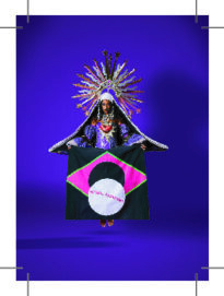 Santinho utilizado como souvenir na exposição curricular "Brasil: Vermelho como Brasa", apresenta na primeira face a figura de uma mulher negra centralizada diante do fundo roxo, caracterizada com vestes roxas e um véu preto, ela segura uma bandeira do brasil estilizada com fundo preto e losango rosa. No verso lê-se em um fundo branco em letras vermelha um texto assinado por Leandro Vieira.