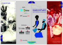 Documento composto por duas imagens. Na primeira temos: a esquerda fotografia de uma moça com o figurino do espetáculo 'Baila, minha porta-estandarte', título da exposição na margem superior e meia lua azul com 3 ondas amarelas que a atravessam na margem inferior; no centro, em fundo cinza, divulgação dos apoiadores e realizadores da exposição, o título da exposição e a metade da representação em desenho de dois humanos negros com instrumentos de percussão do carnaval; a direita fotografia de homem com instrumento de percussão do carnaval, cedida pelo Museu de Porto Alegre Joaquim Felizardo, na margem superior meia lua azul com 3 ondas amarelas que a atravessam e na margem inferior o título da exposição. Na segunda imagem temos: em fundo cinza títulos escritos em letras azuis e textos escritos em letras pretas: mais ao centro temos a metade da representação em desenho de dois humanos negros com instrumentos de percussão do carnaval e abaixo as informações de onde e quando ocorreu a exposição.