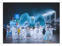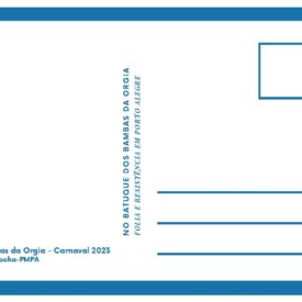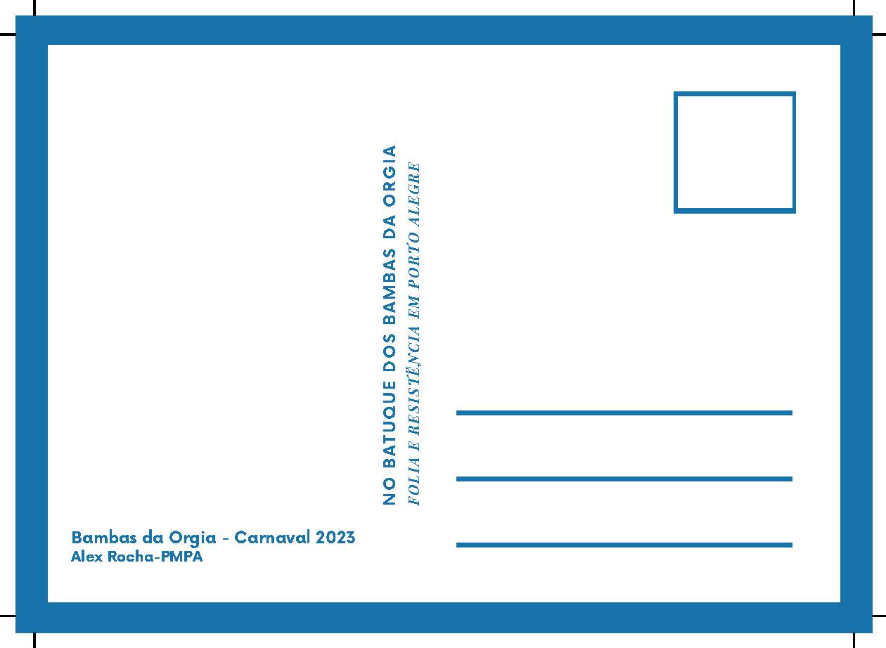 Cópia digital do postal Carnaval 2023 utilizados na divulgação da exposição "No batuque dos Bambas da Orgia - Folia e resistência em Porto Alegre", com anverso apresentando a imagem colorida da comissão de frente e da águia da escola de samba Bambas da Orgia no desfile do Carnaval de 2023. No verso o fundo é branco, fontes na cor azul, apresentando dados da imagem do anverso e o título da exposição, com linhas que são características do verso dos postais e marcas de corte nas extremidades.