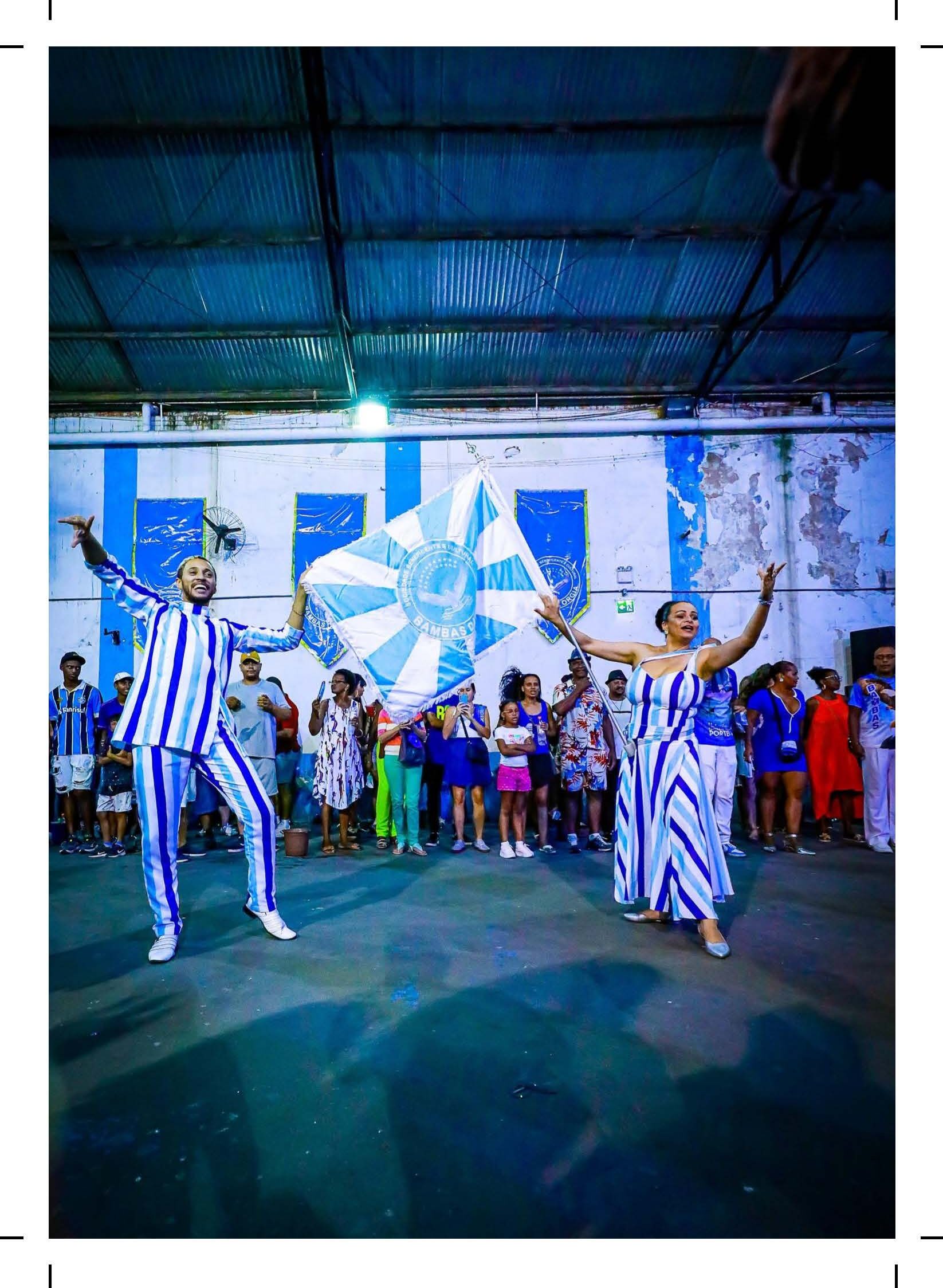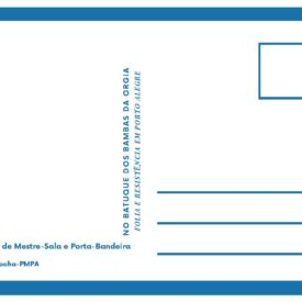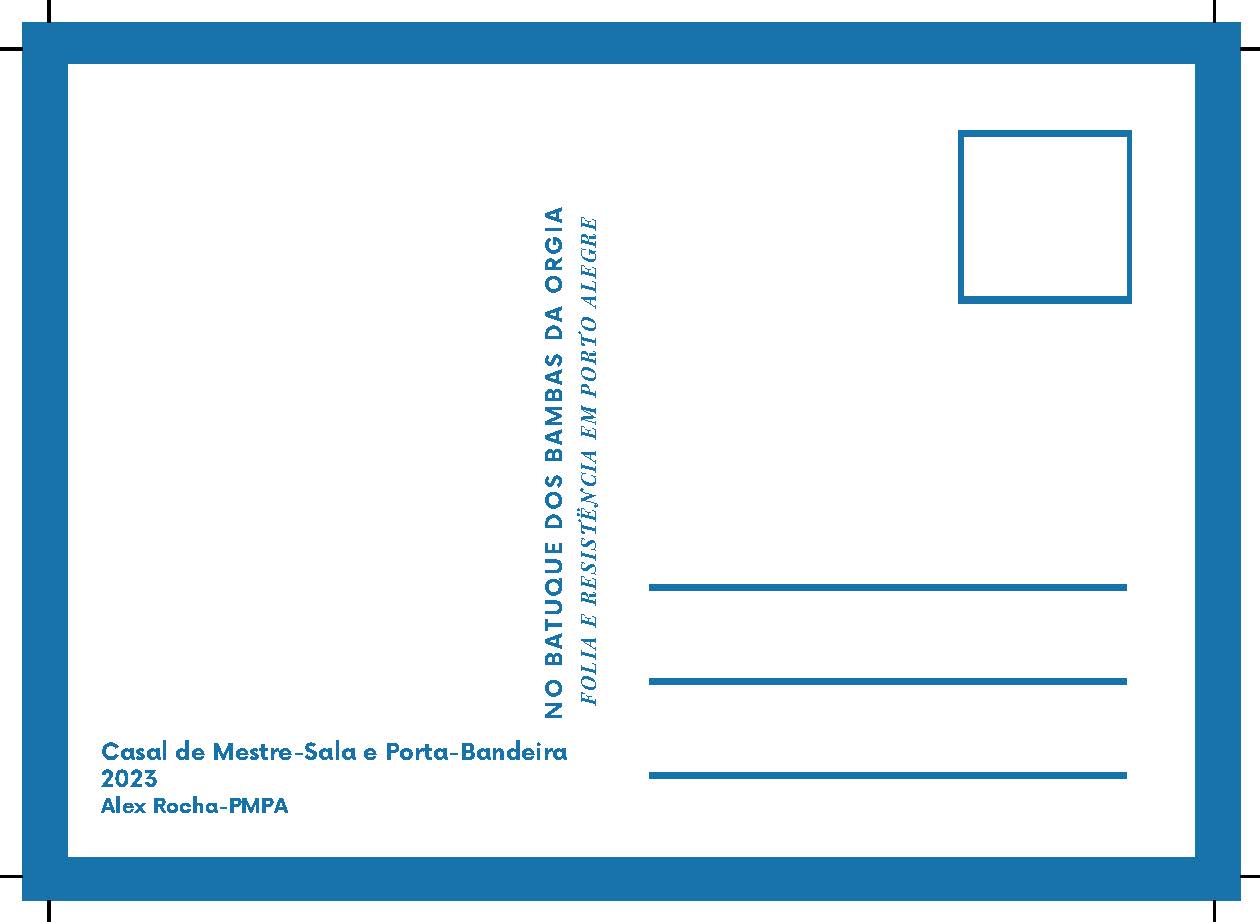 Cópia digital do postal Casal Mestre-Sala e Porta-Bandeira Bambas da Orgia - 2023 utilizados na divulgação da exposição "No batuque dos Bambas da Orgia - Folia e resistência em Porto Alegre", com anverso apresentando a imagem colorida do casal de Mestre-Sala e Porta-Bandeira Bambas da Orgia - 2023 e da bandeira da escola de samba Bambas da Orgia na sede da escola em ensaio 2023, no verso o fundo é branco, fontes na cor azul, apresentando dados da imagem do anverso e o título da exposição, com linhas que são características do verso dos postais e marcas de corte nas extremidades.