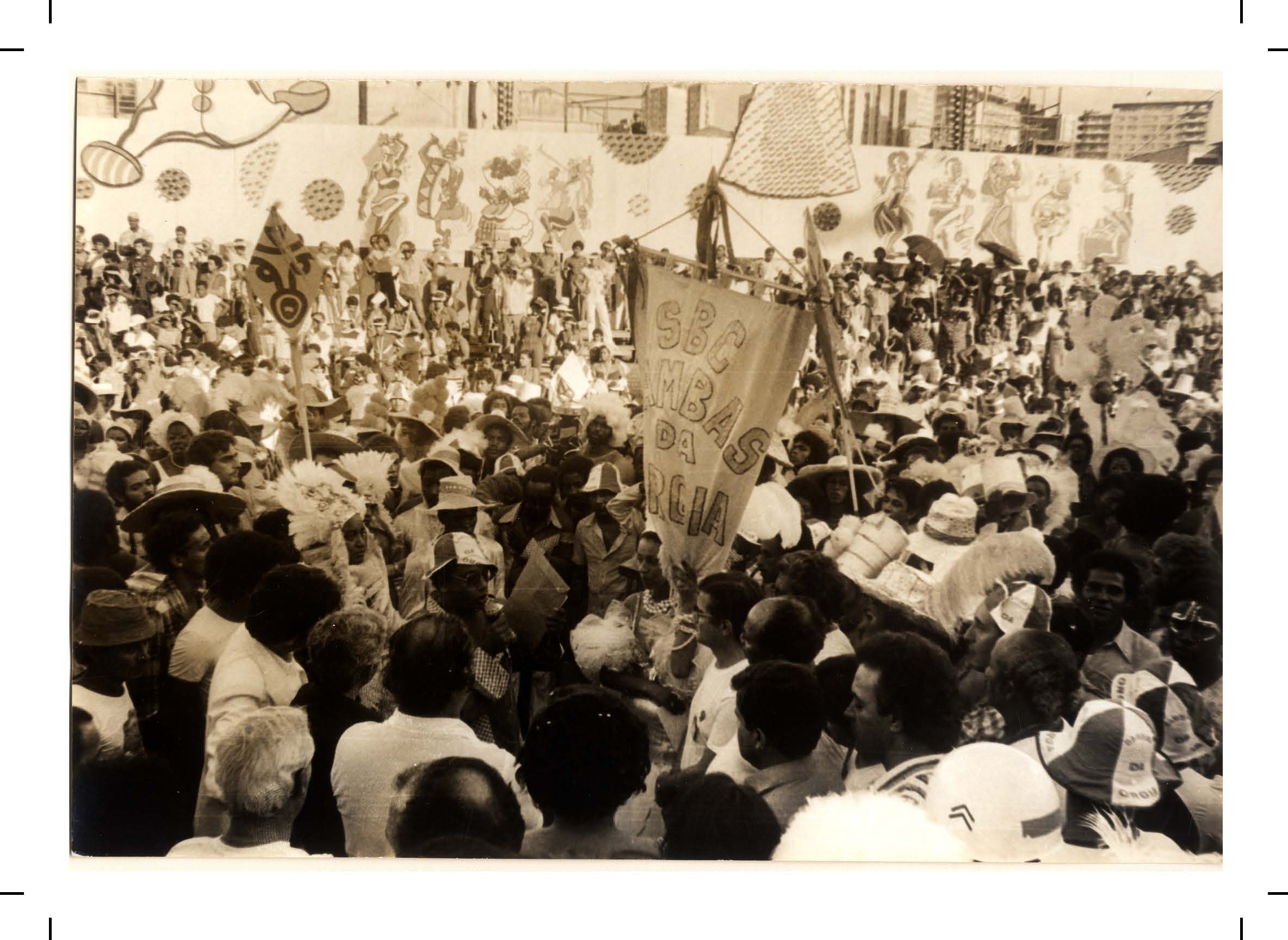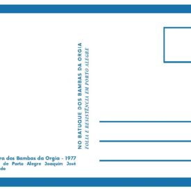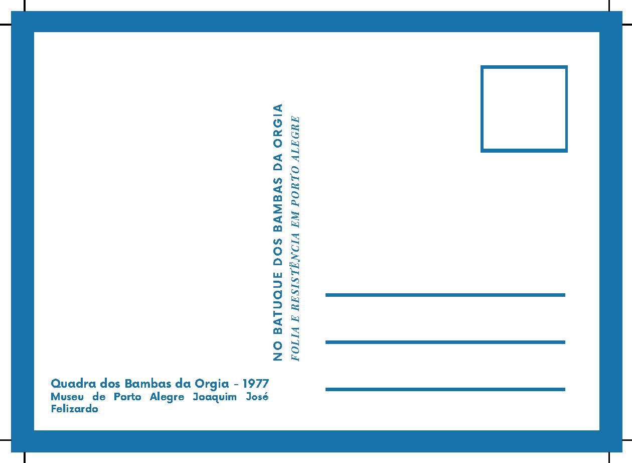 Cópia digital do postal Carnaval 2023 utilizados na divulgação da exposição "No batuque dos Bambas da Orgia - Folia e resistência em Porto Alegre", com anverso apresentando a imagem em tons de sépia de um baile de carnaval realizado pelo Bambas da Orgia de 1977, no verso o fundo é branco, fontes na cor azul, apresentando dados da imagem do anverso e o título da exposição, com linhas que são características do verso dos postais e marcas de corte nas extremidades.