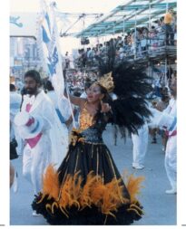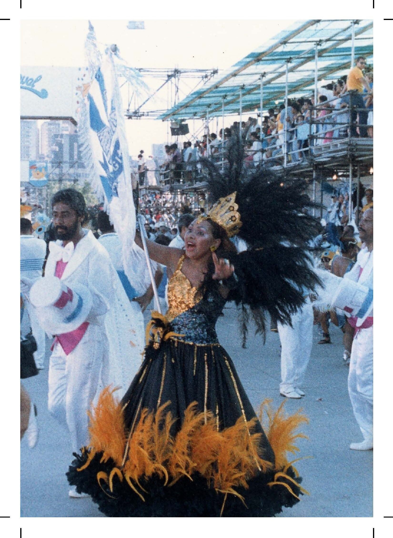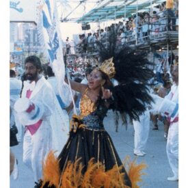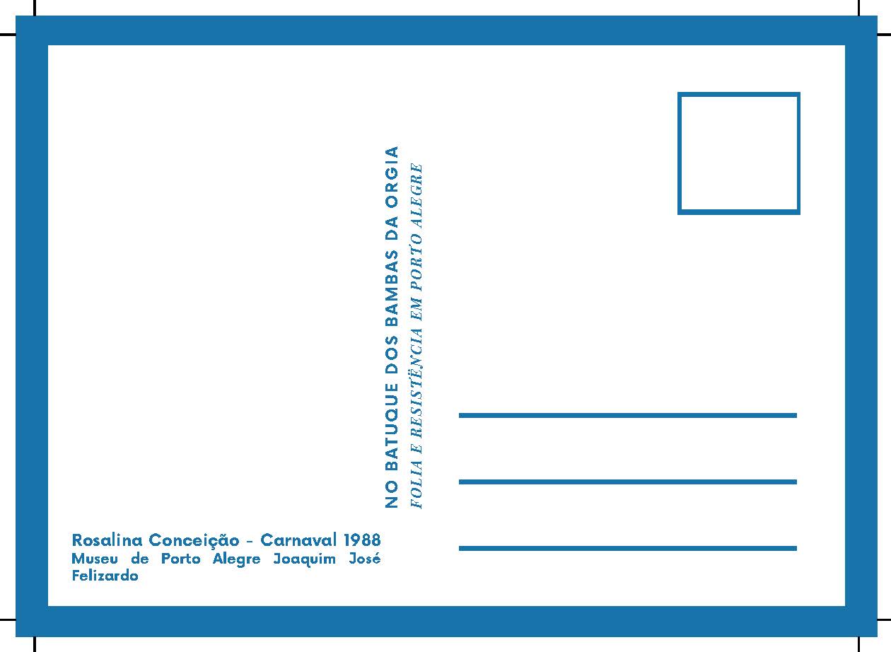 Cópia digital do postal Rosalina da Conceição utilizados na divulgação da exposição "No batuque dos Bambas da Orgia - Folia e resistência em Porto Alegre", com anverso apresentando a imagem colorida de Rosalina da Conceição, porta estandarte da escola de samba Bambas da Orgia, no desfile de 1988, no verso o fundo é branco, fontes na cor azul, apresentando dados da imagem do anverso e o título da exposição, com linhas que são características do verso dos postais e marcas de corte nas extremidades.