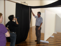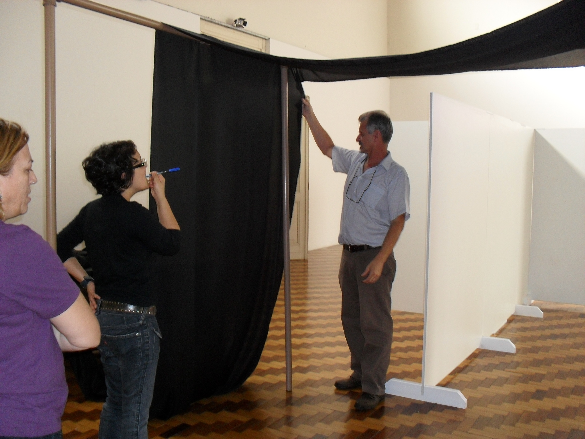 Fotografia da montagem da exposição “Do Confessionário ao Wireless: Landell de Moura, o padre-inventor”. No primeiro plano, à esquerda, uma mulher não identificada e a curadora Luciana Oliveira de Brito. No centro, o curador David Kura Minuzzo segura um tecido preto, parcialmente sobreposto em uma estrutura de PVC. Ao fundo, à direita, avista-se paredes auxiliares na cor branca.