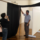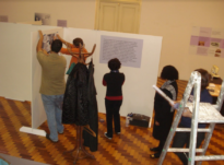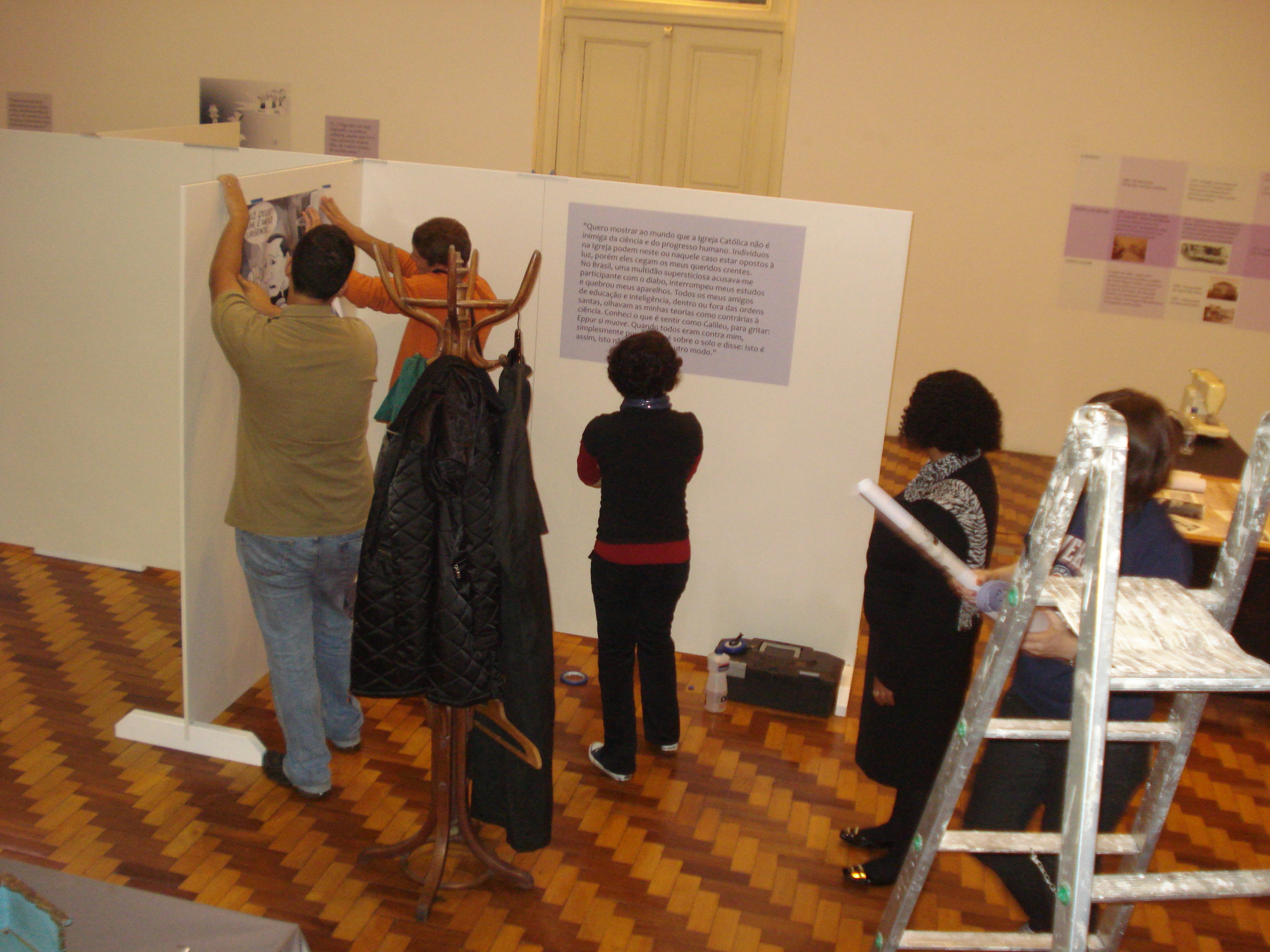 Fotografia da montagem da exposição “Do Confessionário ao Wireless: Landell de Moura, o padre-inventor”. No primeiro plano, à direita, observa-se parcialmente uma escada. No segundo plano, ao centro, um cabideiro de madeira com casacos pretos, cabides e uma batina pendurados. No terceiro plano, identifica-se paredes auxiliares na cor branca e cinco pessoas voltadas para a fixação de artes gráficas nessas paredes. Da esquerda para a direita: o museólogo Elias Machado, um funcionário da gráfica, Luciana Oliveira de Brito, Jeanice Dias Ramos e uma pessoa não identificada, ocultada pela escada. Ao fundo é possível ver a parede branca do Memorial do Rio Grande do Sul e, ao centro, uma porta de madeira.