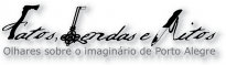 Logotipia composta pelo nome da exposição na cor preta. Na primeira linha, o título "Fatos, Lendas e Mitos" em letras cursivas. Cada palavra do título é iniciada por uma imagem: a letra "F" da palavra Fatos é formada a partir de um machado; a letra "L" da palavra Lendas é formada a partir de uma chave; a letra "M" da palavra Mitos é formada a partir de uma faca. Na segunda linha, o subtítulo "Olhares sobre o imaginário de Porto Alegre" em letras sem serifa e em tonalidade cinza. A logotipia encontra-se em um fundo branco.