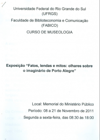 Material de auxílio para visitantes com baixa visão. O material é composto por seis (6) páginas, possuindo no seu conteúdo informações sobre a exposição e os crimes discutidos nesta, escrito em letras grandes. Na capa, vemos em cima no centro o nome da universidade (UFRGS), da faculdade (FABICO) e do curso responsável pela exposição (Museologia). No centro, o nome da exposição: “Exposição “Fatos, lendas e mitos: olhares sobre o imaginário de Porto Alegre” escrito em negrito. Embaixo à direita, vemos informações sobre o local e o período de duração da exposição.