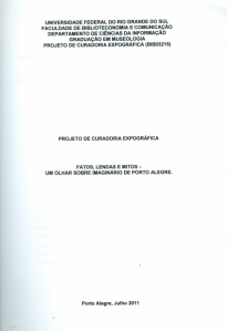 O Projeto de curadoria expográfica, é um material encadernado com trinta e cinco (35) páginas mais os anexos. Na sua capa, temos em cima no centro o cabeçalho: “Universidade federal do Rio Grande do Sul Faculdade de Biblioteconomia e comunicação Departamento de Ciências da Informação Graduação em Museologia Projeto de Curadoria Expográfica (BIB03215) ”. No centro, está escrito “Projeto de curadoria Expográfica” e mais abaixo “Fatos, Lendas e Mitos – Um olhar sobre o imaginário de Porto Alegre. ” Embaixo no centro, escrito: “Porto Alegre, Julho 2011”.