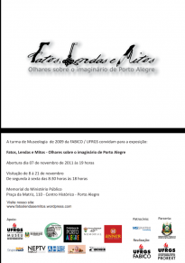 Convite com fundo branco sólido, com impressão no anverso e verso. No anverso, centralizado, o título e o subtítulo da exposição no formato da logotipia, em cor preta, com sombra externa de deslocamento central na cor cinza arroxeado. No verso, em cima e alinhado à esquerda, a frase: "A turma de Museologia de 2009 da FABICO / UFRGS convidam para a exposição:" em letras pretas. Em negrito abaixo da frase anterior, o trecho: "Fatos, Lendas e Mitos - Olhares sobre o imaginário de Porto Alegre". Abaixo, a frase: "Abertura dia 07 de novembro de 2011 às 19 horas" e a seguir: " Visitação de 8 à 21 de novembro De segunda à sexta das 8:30 horas às 18:00 horas". Sequencialmente: "Memorial do Ministério Público Praça da Matriz, 110 - Centro Histórico - Porto Alegre”. A última informação sinaliza o endereço eletrônico: "Visite o nosso site: www.fatoslendasemitos.wordpress.com". As informações acima estão em letras sem serifa, na cor preta. Embaixo à esquerda, a palavra: "Apoio:" e abaixo desta, a logotipia dos apoiadores da exposição. Embaixo à direita, as palavras: "Patrocínio:", "Parceria:" e "Realização:", seguidas dos respectivos logotipos.