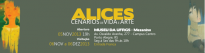 A frente, em fundo verde, apresenta na área superior central o nome da exposição “ALICES” em amarelo, acima de “CENÁRIOS de VIDA e ARTE”. Na área central, posicionado à esquerda, “Abertura” na cor branca, acima de “05” em amarelo, “NOV” na cor branca, “2013” na cor amarela, “19h” na cor branca. Abaixo, na cor branca, “Visitação”, acima de “06” em amarelo, “NOV” na cor branca, “a 06” em amarelo, “DEZ” na cor branca, “2013” na cor amarela. Ao lado, na área central direita, “MUSEU DA UFRGS – Mezanino” na cor branca, acima de “Av. Osvaldo Aranha, 277 - Campus Centro”, acima de “Porto Alegre, RS”, acima de “Seg à Sex das 9h às 18h”, acima de “Entrada Franca” em amarelo. Ao lado esquerdo da imagem, uma obra de Alice Soares legendada como “SOARES, Alice: Menina – Obra inacabada”. Ao lado direito, uma obra de Alice Brueggemann, legendada como “BRUEGGEMANN, Alice: Óleo sobre tela”.