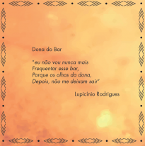 Plotagem criada para adesivagem da mesa do Núcleo Bar da Exposição "AGÔ". Possui uma estrofe da canção "Dona de Bar", de Lupicínio Rodrigues nascido em Porto Alegre em um bairro pobre da cidade, a Ilhota, no dia 16 de setembro de 1914 era um negro boêmio, que circulava de bar em bar pela cidade. Foi escolhida uma de suas músicas por ser um dos maiores representantes talvez da cultura negra Porto alegrense, no sentido de manter as raízes e através da música denotar seu sentimentos e romantismo. Lupi, era conhecido como o inventor da dor de cotovelo. A música a qual sua estrofe foi escolhida para a plotagem foi criada no ano de 1973, ela fazia parte do último disco que Lupicínio gravou "Dor de Cotovelo". A mesa a qual foi realizada essa plotagem obtinha além da estrofe da canção, uma caixa de fósforo logotipia adesivada, copinhos e uma garrafa de cerveja com rótulo antigo, além de cadeiras que possibilitavam sentar-se nelas e interagir com o ambiente, fazendo com que os visitantes pudessem sentir a alma dos bares frequentados pela negritude boêmia.