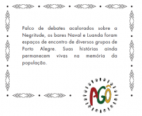 Esta plotagem foi criada para elucidar através da iniciativa de denotar a importância que os bares possuíam para a Negritude porto alegrense, pois era em seus ambientes que ocorriam grande parte dos encontros e reuniões. Um espaço de sociabilidade, marcado pelas relações simbólicas que concretizam a hibridização de culturas e um local criador de relações sociais onde se discutiram as práticas de resistência negra na cidade de Porto Alegre. Dois bares são referência na cidade quando o tema é a cultura negra: Bar Luanda e Bar Naval, ambos frequentados por negros no período recortado para a Exposição. Devido essa relação estreita entre resistência, sociabilidade, lugar de criação e musicalidade, "AGÔ" ganhou um Bar composto por balcão com cenografia de época, uma mesa com fragmento de música de Lupicínio Rodrigues, cadeiras, a caixa de fósforo tal qual uma das tantas tamboriladas por Lupe em suas composições, um painel fotográfico com imagem do Luanda, um rádio de 1950, peça do Acervo do Museu da Comunicação Hipólito José da Costa e um Sopapo.