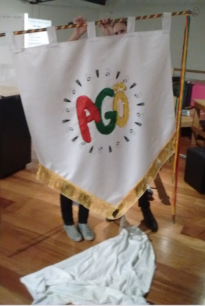 Esta fotografia foi retirada em um dia de momento de montagem da exposição. Neste fia o estandarte estava sendo finalizado, estandarte este que esteve exposto na parede das escadas que sobem do andar térreo ao mezanino. Nesta fotografia não foi possível identificar as discentes que estavam segurando o estandarte para o momento da foto, porém, pretende-se buscar informações de quem elas são. Esta foto foi retirada pela Turma BIB03217 Prática de Exposições Museológica 2015/1.
