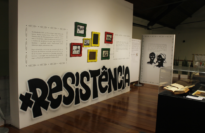 No primeiro plano consta parede (painel) com plotagem de textos e da palavra em letras pretas e desenhada RESISTÊNCIA abaixo dos textos. A direita da fotografia ainda em primeiro plano esta uma bancada preta expositiva com com objetos expostos em seu interior, contando com encaixe protetor de vidro. No segundo plano ao fundo, estão os painéis com plotagens à esquerda, ao centro a escada com as grades do mezanino que se dirigem ao andar térreo do Museu. À direita esta uma bancada preta expositiva com com objetos expostos em seu interior, contando com encaixe protetor de vidro. Em terceiro plano esta pendurado o estandarte na parede que segue a descida e subida da escada, podendo assim perceber a parede, as instalações elétricas e as lâmpadas da exposição.