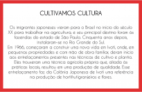 Apresenta na margem superior, centralizado, o título “CULTIVAMOS CULTURA” na cor preta, seguido de um texto de três parágrafos. No primeiro parágrafo se lê “Os imigrantes japoneses vieram para o Brasil no início do século XX para trabalhar na agricultura, e seu principal destino foram às fazendas do estado de São Paulo. Cinquenta anos depois, instalaram no Rio Grande do Sul.”, acima do segundo parágrafo, que apresenta “Em 1996, começaram a construir uma nova vida em Ivoti, onde, em pequenas propriedades e com mão de obra familiar, deram início aos entrelaçamentos presentes nas técnicas de cultivo e plantio.”, no terceiro parágrafo, por fim, se lê “Eles trouxeram uma técnica agrícola própria que, aliada às praticas locais, resultou em uma produção de qualidade. Esse entrelaçamento faz da Colônia Japonesa de Ivoti uma referência na produção de hortifrutigranjeiros e flores.”.